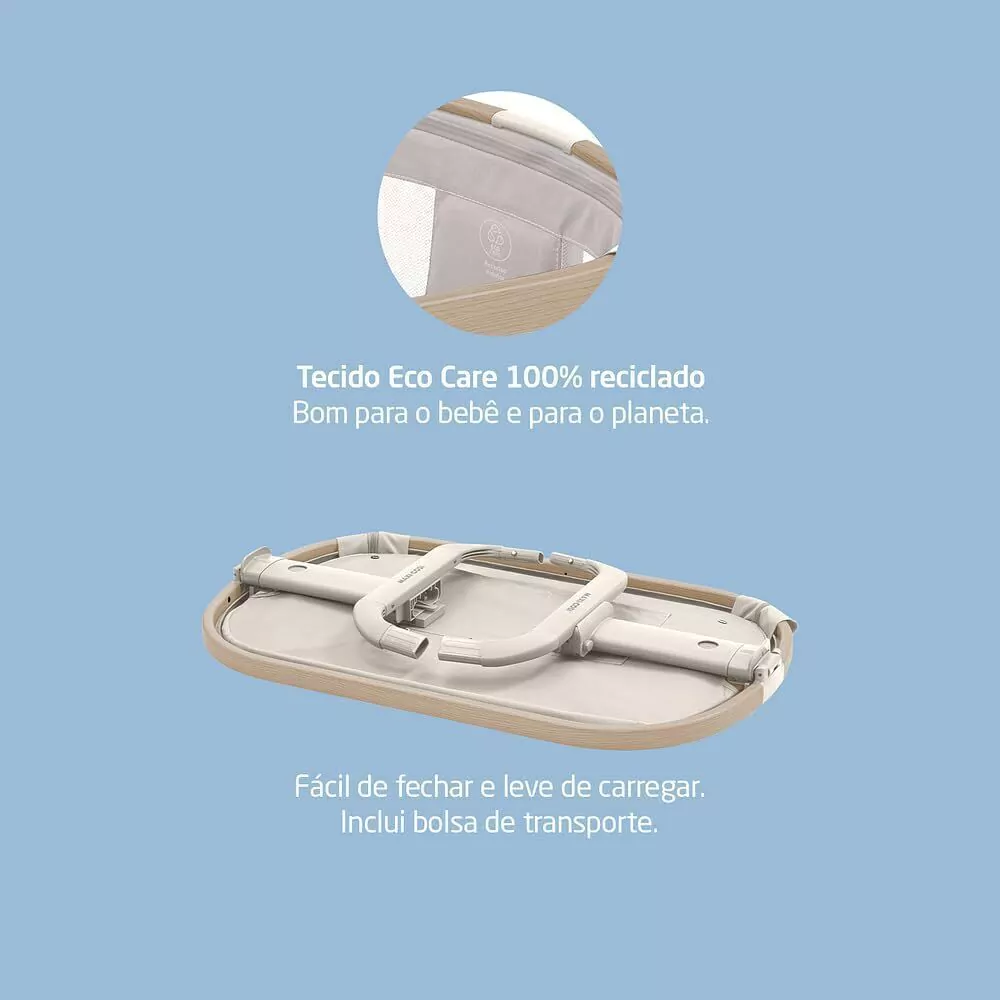 Bem ao seu lado.Geralmente, a escolha do berço é o grande foco das compras do enxoval do bebê, principalmente dos pais de primeira viagem que podem ter muitas dúvidas e inseguranças sobre o móvel mais apropriado. Pensando nisso, a Maxi-Cosi, referência há mais de 30 anos no transporte de famílias, projetou o moderno e confortável berço Iora Air.Como escolher o berço ideal?A seleção do berço adequado para o seu pequeno está atrelada a uma série de aspectos que precisam ser considerados antes de a compra ser efetuada. Afinal, trata-se de um móvel cuja nobre função é fornecer um cantinho seguro para deixar o bebê com ou, em alguns casos, sem supervisão.A segurança é o item mais relevante na hora de analisar o modelo e a marca do berço. Procure verificar se o fabricante cumpre os critérios de segurança estabelecidos pelo INMETRO. Dessa maneira, o seu filho fica protegido e você evita acidentes.Como o item também faz parte da decoração do ambiente, o design é fundamental para uma escolha certeira e nisso está incluso o estilo, a realidade da família e o tamanho do investimento disponível. Ah, claro, um design que priorize o conforto e o bem-estar da criança é imprescindível.Conheça o Iora AirO berço Iora Air foi projetado pela Maxi-Cosi a fim de priorizar ao máximo o conforto do bebê. Para isso, ele é arejado com tecidos respiráveis, macios, de qualidade premium e totalmente reciclados. Além disso, ele conta com a função balanço calmante, que ajuda a tranquilizar o seu pequeno em momentos mais desafiadores.Design diferenciadoAlém da função berço balanço, o Iora Air tem uma estética elegante e com efeito de madeira, encaixando-se nos ambientes domésticos. Feito em tecidos desenvolvidos a partir de garrafas plásticas 100% recicladas e com o sistema Eco Care, ele é amigável com o meio ambiente, além de ter muita qualidade e ser confortável.O Iora Air é também um berço com tela em toda a volta, tornando-o mais respirável porque consegue maximizar a circulação de ar. Aliás, para garantir mais praticidade aos pais, esse artigo conta com um grande cesto de armazenamento localizado na parte de baixo, garantindo que todos os itens essenciais do seu filho estejam ao seu alcance.Bem-estar aliado à praticidadeQuando o seu bebê é pequeno e indefeso, é importante mantê-lo por perto para que ele se sinta mais protegido. Para isso, o Iora Air tem tiras de segurança para fixação do berço ao lado da cama e função de deslizamento lateral.Esse berço ajuda, também, a aliviar o seu filho de pequenos incômodos, como refluxo ou congestionamento nasal. Isso porque possibilita cinco ajustes e regulagem de altura diferentes em cada lado. Além disso, ele é perfeito para viagens e passeios em família, sendo bem simples de ser transportado.As rodas embutidas presentes no Iora Air permitem que ele seja facilmente deslocado de um cômodo para outro. Ainda, trata-se de um berço dobrável e leve, acompanhado de uma bolsa de transporte.Projetado especialmente para os recém-nascidosA Maxi-Cosi desenvolveu o berço Iora Air, pertencente à Linha Casa, pensando nos primeiros meses de vida da criança. Por isso, seu uso é indicado desde o nascimento até os 9 kg, aproximadamente seis meses de idade. Assim, ele ajuda a fortalecer o vínculo emocional entre pais e bebê, contribuindo para o desenvolvimento dos pequenos.Além do uso como co-sleep, o colchão confortável e resistente do berço Iora Air permite dar ao seu filho o seu próprio espaço, quando assim for necessário. Desse modo, ele funciona perfeitamente como berço autônomo no modo desacoplado da cama dos pais.Dê ao seu filho o conforto e a segurança que só os produtos Maxi-Cosi oferecem!Nós da Maxi-Cosi, somos referência há mais de 30 anos no transporte seguro de famílias. Fornecemos, por meio dos nossos diversos produtos, o bem-estar necessário para manter a sua família tranquila e feliz. Assim, aproveite e continue navegando no nosso site e conheça a nossa Linha Conectada, os nossos carrinhos e as nossas cadeirinhas.
