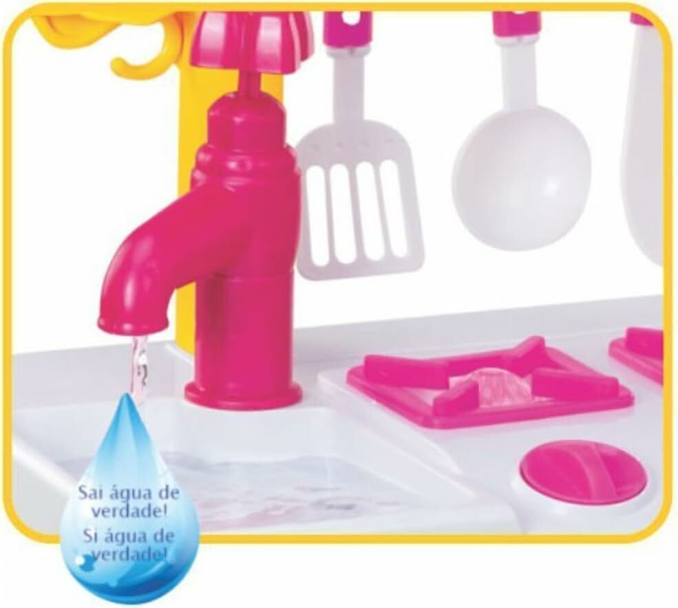 COZINHA TURMA DA MÔNICA COM ÁGUA - MAGIC TOYSA Cozinha da Turma Da Mônica chegou para completar a casinha dos sonhos das pequenas! Possui design arrojado com cores elegantes, e muitos acessórios para brincar de montão.Ela tem torneirinha que saí água de verdade, com microondas, forninho e geladeira com portas que abrem e fecham, além de muitos acessórios como pratinhos, talheres e um lindo bolo!Brinquedo que permite à criança imitar, imaginar, criar, simular e reproduzir situações do cotidiano familiar.Estimula e desenvolve o aprendizado infantil através do faz de conta, a organização e a utilização dos utensílios da cozinha. Tudo isso enquanto a criança se diverte!ESPECIFICAÇÕES:- Recomendado à partir de 03 anos- Dimensões da embalagem (CLA): 47,5 x 17,5 x 67,5 cm- Dimensões do produto:- Comprimento: 48 cm- Largura: 24,3 cm- Altura: 72 cm- Torneirinha saí água- Forninho- Geladeira- Micro-ondas- Porta talheres- Acompanha acessórios, Boleira e Bolo- Embalagem decorada- Personagem: Turma Da Mônica- Marca: Magic Toys- Referência: 8076- Certificado de Segurança: INMETRO