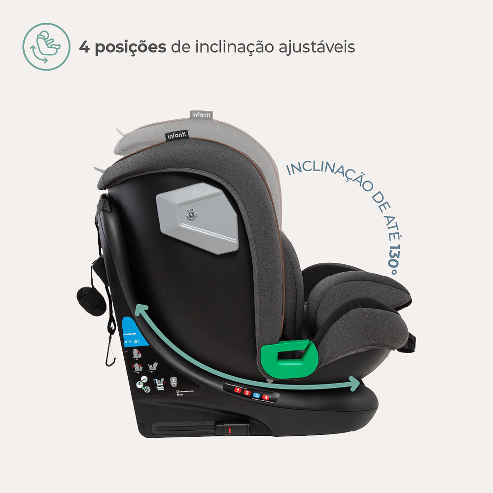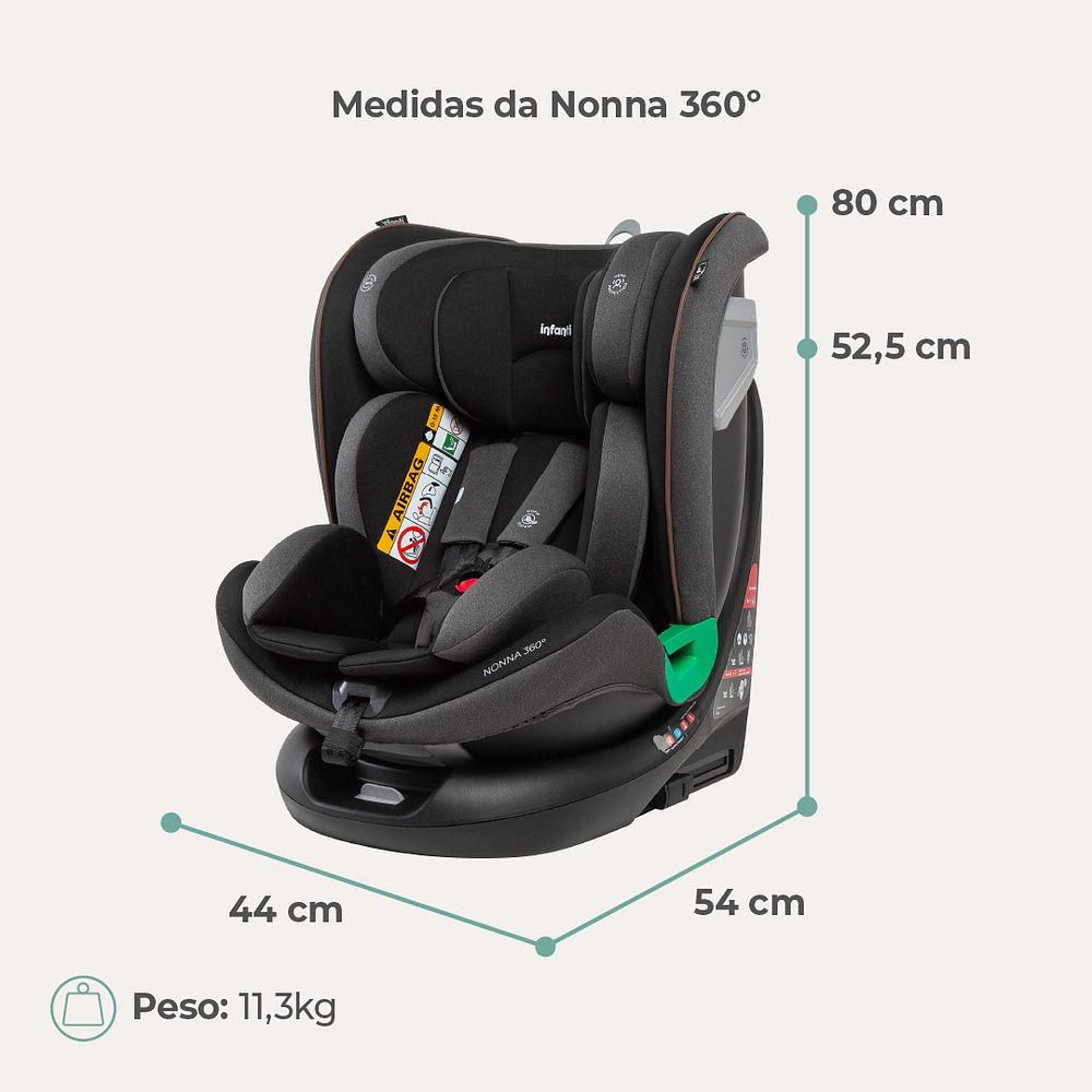 Descrição Completa A Nonna 360° é a escolha certa para os passeios de carro da sua família. Além de estilosa e moderna, ela possui características que foram desenvolvidas levando em consideração a segurança e o conforto do bem mais precioso que existe: o seu bebê. Com rotação 360° e aprovada na norma i-Size, é a união ideal de modernidade e aconchego. Colocar e tirar o bebê da cadeirinha no carro, achar a posição mais confortável, garantir que ele esteja seguro... um passeio de carro parece simples, mas pode ser desafiador. Nós entendemos esse momento e criamos a Nonna 360°, uma cadeirinha moderna e estilosa que possui características desenvolvidas para aliar o que tem de mais inovador em segurança e usabilidade. Nós pensamos a Nonna 360° para ser um jeito de oferecer para seu beb ê o mesmo carinho e aconchego que ele teria se estivesse passeando no colo da sua vovô. A Nonna 360° possui uma inovadora base em L e o sistema Easy Rotation, que permite que o assento gire completamente ao ser fixada no carro – pense em como será mais fácil colocar e retirar seu pequeno em uma cadeirinha que permite girar para a porta do carro. Em viagens mais longas, a recomendação da maioria dos especialistas é que seu bebê esteja voltado para trás pelo menos até os 15 meses – e a Nonna 360° permite isso com facilidade. Ainda falando de modernidade, a cadeirinha foi aprovada pela norma europeia i-Size, que leva em consideração a altura da criança na hora de escolher a cadeirinha ideal. Essa norma também prevê testes muito rigorosos de segurança, impacto e uso prolongado de costas – todos aprovados na cadeirinha Nonna 360°. Além disso, ela possui cinto de cinco pontos com protetores acolchoados ajustáveis. Para oferecer essa sensação de colinho de vó, a Nonna 360° se sa i muito bem. Os produtos da Infanti possuem inspiração no design italiano, e a cadeirinha além de ser muito estilosa, possui superfície acolchoada, com redutor adaptável ao crescimento – para recém-nascidos até os 60cm, possui espuma extra no assento, que é removível e amplia o uso. E claro, pensando na rotina corrida, o tecido da capa cadeirinha é macio e removível, podendo ser colocado na máquina de lavar. Para todas as fases, do nascimento até aproximadamente os 10 anos (de 40 a 150 cm) Aprovada pela norma europeia I- Size, garantido segurança Sistema de base em L, que permite giro 360° - mesmo instalada. Praticidade de verdade! Mais tempo na posição mais segura para seu filho: uso de costas ao movimento até 105 cm (aprox. 4 anos). Proteção extra contra impactos laterais aprimorada, sem abrir mão do conforto 4 posições de inclinação ajustáveis Super acolchoada, com tecido macio e memory foam na região da cabeça e no redutor para recém-nascidos Prático na limpeza: a capa pode ser removida e vai à máquina de lavar Redutor acolchoado com formato adaptável ao crescimento Cintos de 5 pontos com protetores acolchoados e ajustáveis em altura Fácil de instalar: O sistema Isofix minimiza o risco de instalação incorreta. *Verificar a compatibilidade do veículo antes da compra