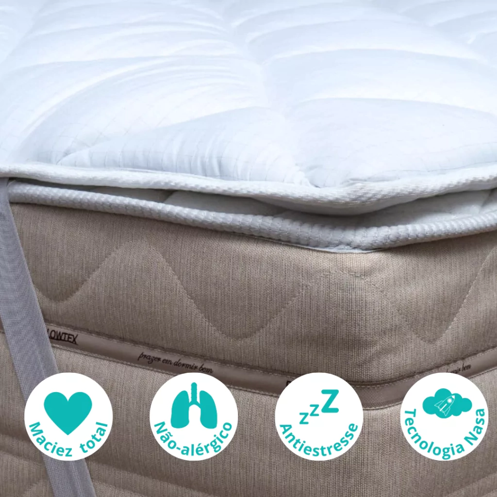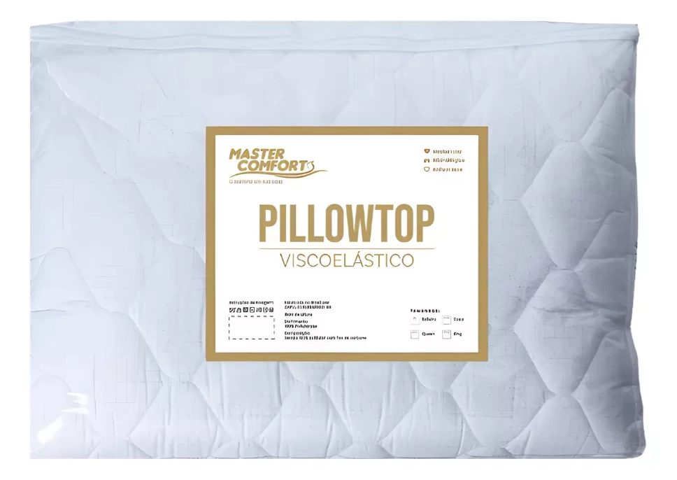 Protetor de Colchão Pillow Top Queen Viscoelástico 158x198 - Master ComfortO Pillow Percal de viscoelástico é um produto único e exclusivamente feito para oferecer mais conforto. Apresenta em sua composição o diferencial de viscoelástico, um material que promove toque aveludado e suave, aumentando assim a sensação de conforto ao dormir. Possui seu revestimento em tecido que alia elegância, durabilidade e maciez, garantindo maior conforto além de não reter calor. Este produto conta ainda com elásticos laterais que reforçam a fixação nos cantos do colchão e proporcionam maior estabilidade e conforto ao dormir.CARACTERÍSTICAS:- Enchimento Viscoelástico- Um lado bordado e outro liso- Elásticos Laterais- Queen: 6 x 198 x 158