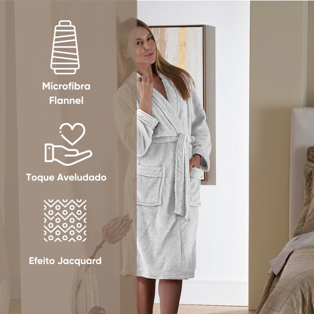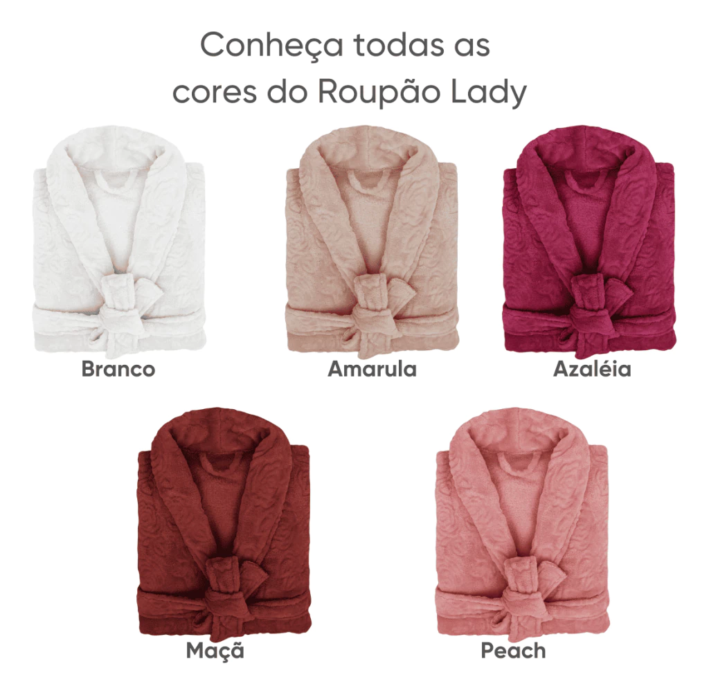 O design do Roupão Microfibra Flannel Lady reflete o cuidado da Appel Home com as sutilezas que fazem a diferença. O efeito carved com detalhes ornamentais, o bolso frontal prático, o cinto para ajuste e a gola xale compõem um visual sofisticado sem abrir mão do conforto. Com diversas cores disponíveis, há uma opção para cada gosto, permitindo que você escolha a que melhor combina com seu estilo pessoal ou decoração do quarto.