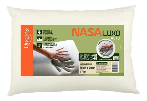 NASA é uma espuma viscoelástica moldada com alta viscosidade e densidade. Automoldável e termossensível, adapta-se ao contorno e a temperatura do corpo, exercendo menos pressão nas áreas mais quentes ou salientes, facilitando a circulação sanguínea. Além de oferecer maior capacidade de absorção do peso e distribuição equalizada da pressão sobre o corpo, o travesseiro NASA possui a propriedade de retorno lento ou memória, agindo como um verdadeiro amortecedor. A alta qualidade da espuma viscoelástica Duoflex, permite ao travesseiro NASA retornar à sua forma original, mesmo após compressão durante o transporte. Tudo isso torna o travesseiro NASA o ideal para a posição natural de descanso, prevenindo dores na cabeça, pescoço, costas, braços e ombros, garantindo um sono restaurador, com total proteção antiácaros, fungos e bactérias. *** É embalado a vácuo.