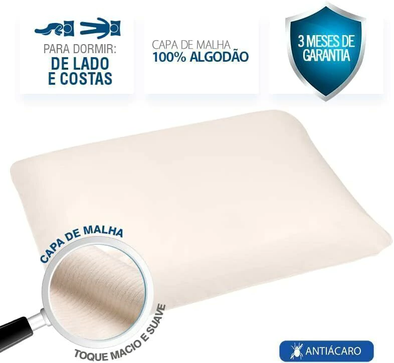 Travesseiro Duoflex Nasa-x Alto Capa 100% Algodão Para Fronha 50x70cmExtremamente confortável, o travesseiro NASA-X Alto da Duoflex apresenta excelente relação entre suporte e flexibilidade, fornecendo total sustentação da cabeça durante o sono!NASA é uma espuma viscoelástica moldada com alta viscosidade e densidade. Automoldável e termossensível, adapta-se ao contorno e a temperatura do corpo, exercendo menos pressão nas áreas mais quentes ou salientes, facilitando a circulação sanguínea.Tudo isso torna o travesseiro NASA-X Alto o ideal para a posição natural de descanso, prevenindo dores na cabeça, pescoço, costas, braços e ombros, garantindo um sono restaurador, com total proteção antiácaros, fungos e bactérias!----- Especificações -----Marca: DuoflexModelo: NS3109Código de Barras: 7896806210872Tamanho (cm): 40x60 (para fronhas 50x70cm)Altura (cm): 13Espuma: 100% poliuretanoCapa: 100% algodão